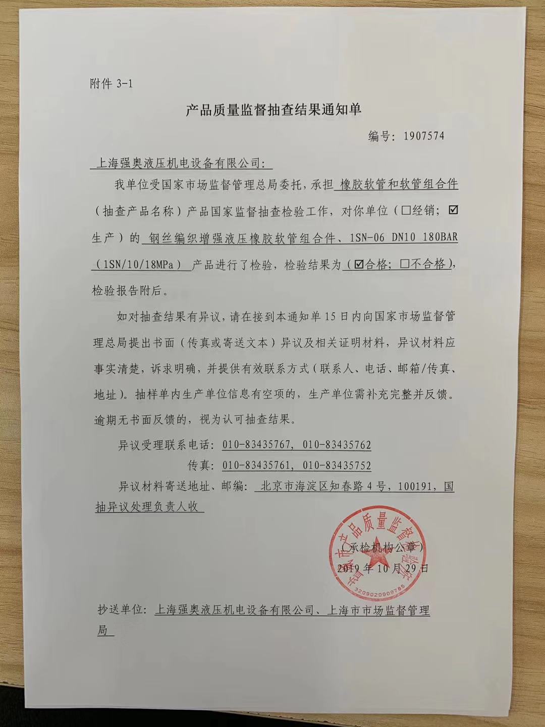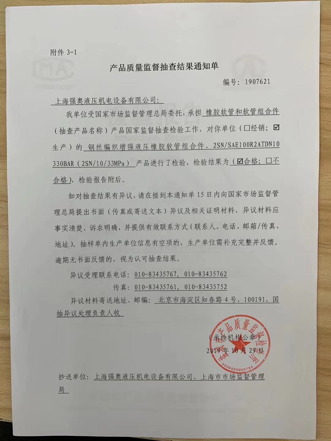 熱烈祝賀 上海強奧液壓機電設(shè)備有限公司 于2019年10月29日順利通過 國家市場監(jiān)督管理局 對我司2個批次的產(chǎn)品質(zhì)量監(jiān)督抽查!